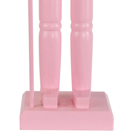 The nutcracker rests on a sturdy square pink base