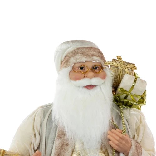 Santa is carrying a wrapped present and a small gold-colored reindeer in one hand