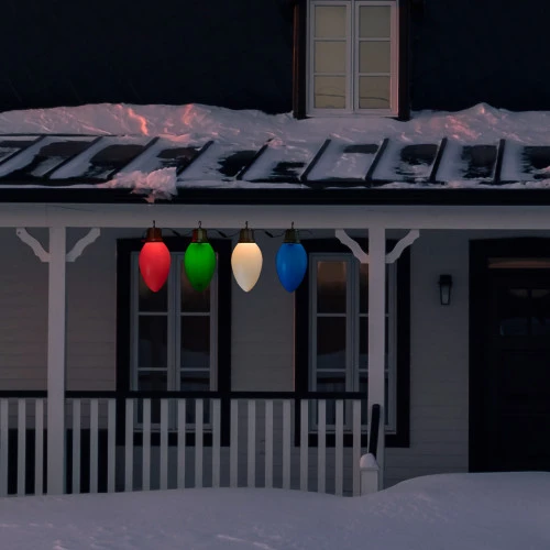 Each decoration is lighted with 1 clear replaceable C7 glass bulb